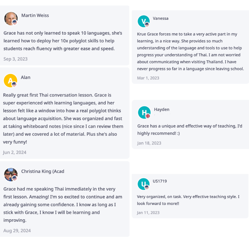 "I had the pleasure of taking Grace's 'Absolute Zero to Conversational Beginner Thai' course, and I wholeheartedly recommend it to anyone serious about learning Thai.